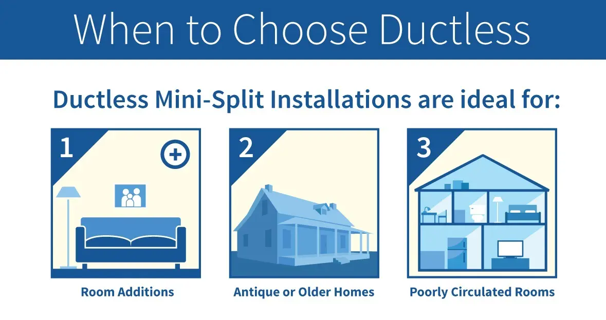Room add-ons: Ductless mini-split systems are a common heating and cooling solution for room additions. They are less complicated and more flexible than traditional central air systems. Installing or extending current ductwork is not always practical. Ductless mini-split systems offer a space-saving solution with the ability to be wall mounted, floor mounted, or ceiling suspended without the hassle or expense of installing additional ductwork.